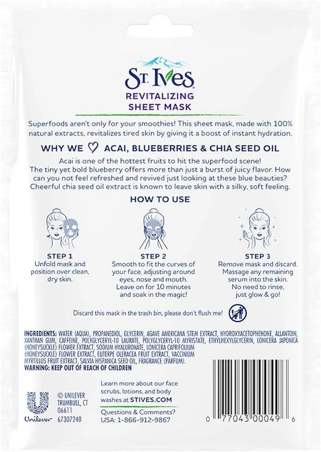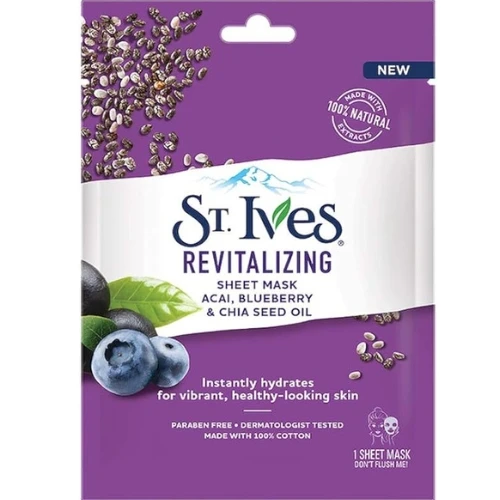 Revitalize your skin with the power of superfoods! St. Ives Revitalizing Sheet Mask is infused with 100% natural extracts of acai, blueberry, and chia seed oil to instantly hydrate and refresh tired skin, leaving it vibrant and glowing.
